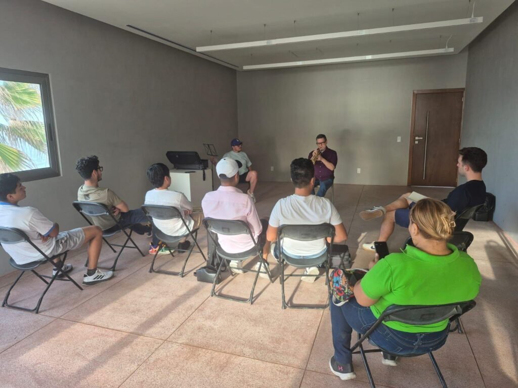 La tarde del viernes, el Museo Casa del Marino se llenó de luz, brisa marina y un ambiente de total concentración, frente a un pequeño grupo de estudiantes, Rex Richardson tomó asiento, trompeta en mano, para ofrecer una masterclass que más que una clase sobre técnica, fue una conversación cercana, honesta y llena de humanidad.