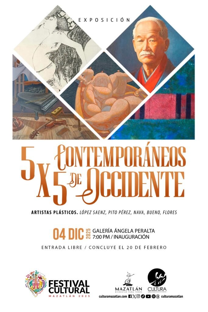 El Festival Cultural Mazatlán 2025 inaugurará el jueves 4 de diciembre a las 7:00 P.M. la exposición “5 X 5 Contemporáneos de Occidente” en la Galería Ángela Peralta. Esta muestra, que estará abierta al público con entrada gratuita hasta el 20 de febrero de 2026, es un homenaje al invaluable legado de cinco destacados artistas plásticos del Noroeste de México.