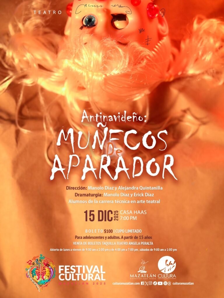 - El Festival Cultural Mazatlán 2025 presentará el estreno de la hilarante comedia teatral “Antinavideño: Muñecos de aparador”, una producción que promete risas y nostalgia, creada y protagonizada por el talento del Centro Municipal de las Artes (CMA).