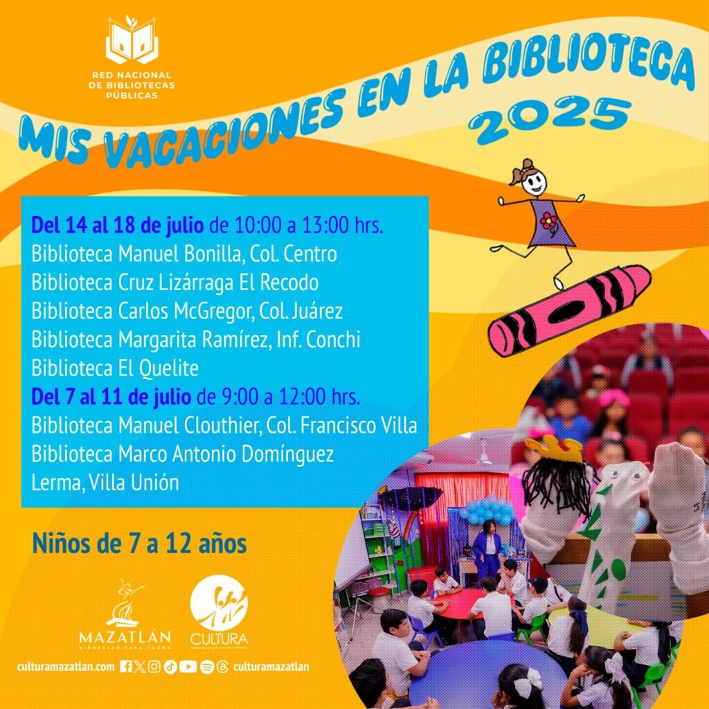 El Instituto Municipal de Cultura, Turismo y Arte de Mazatlán, a través del Centro Municipal de Artes y las Bibliotecas Públicas de Mazatlán, invita a padres de familia a inscribir a sus hijos en el Taller de Verano que se llevará a cabo en la Biblioteca Marco Antonio Domínguez Lerma, ubicada en la Plazuela de Villa Unión.